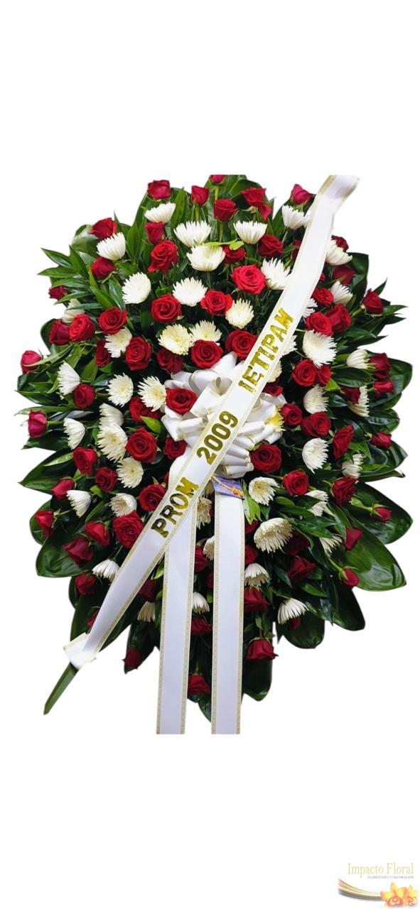 Fúnebre premium elaborado con la mejores rosas rojas de impacto floral y crisantemos blancos, tiene de altura 2 metros. cinta marcada