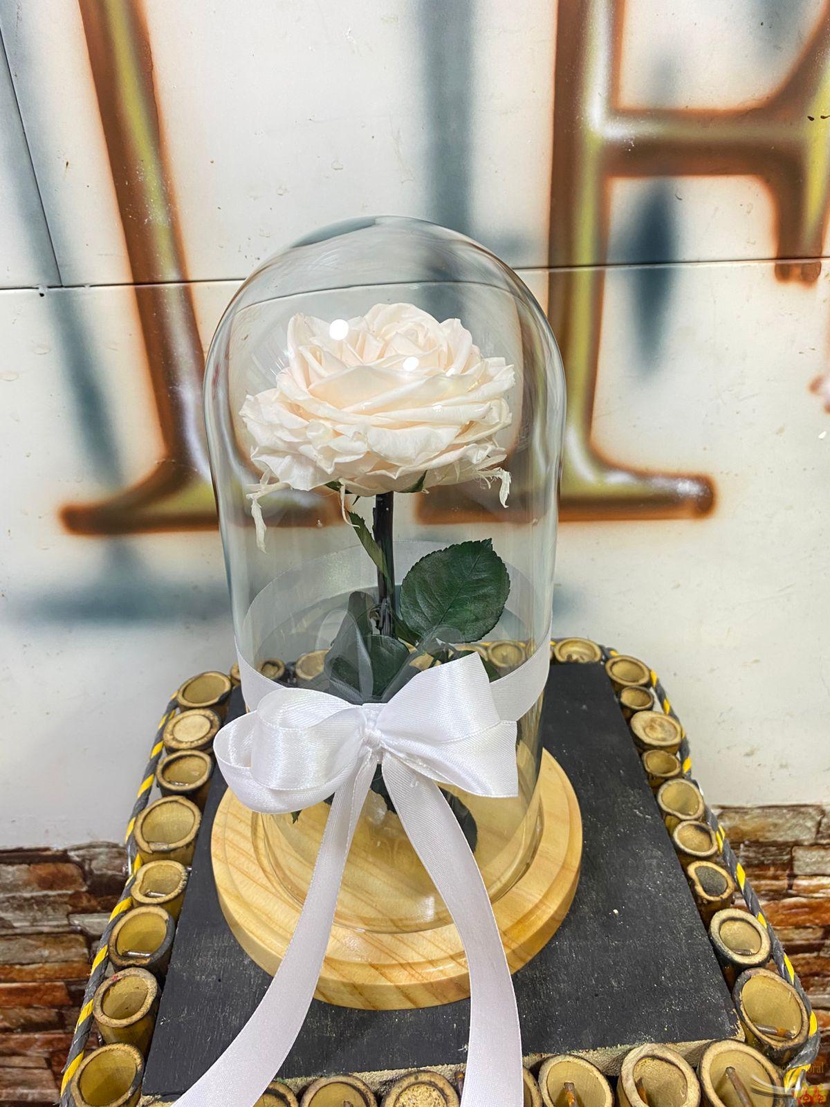 Rosa Preservada Blanca que dura aproximadamente 3 años con los siguientes cuidados: Mantener la urna limpia y en su lugar, Debe recibir luz solar.