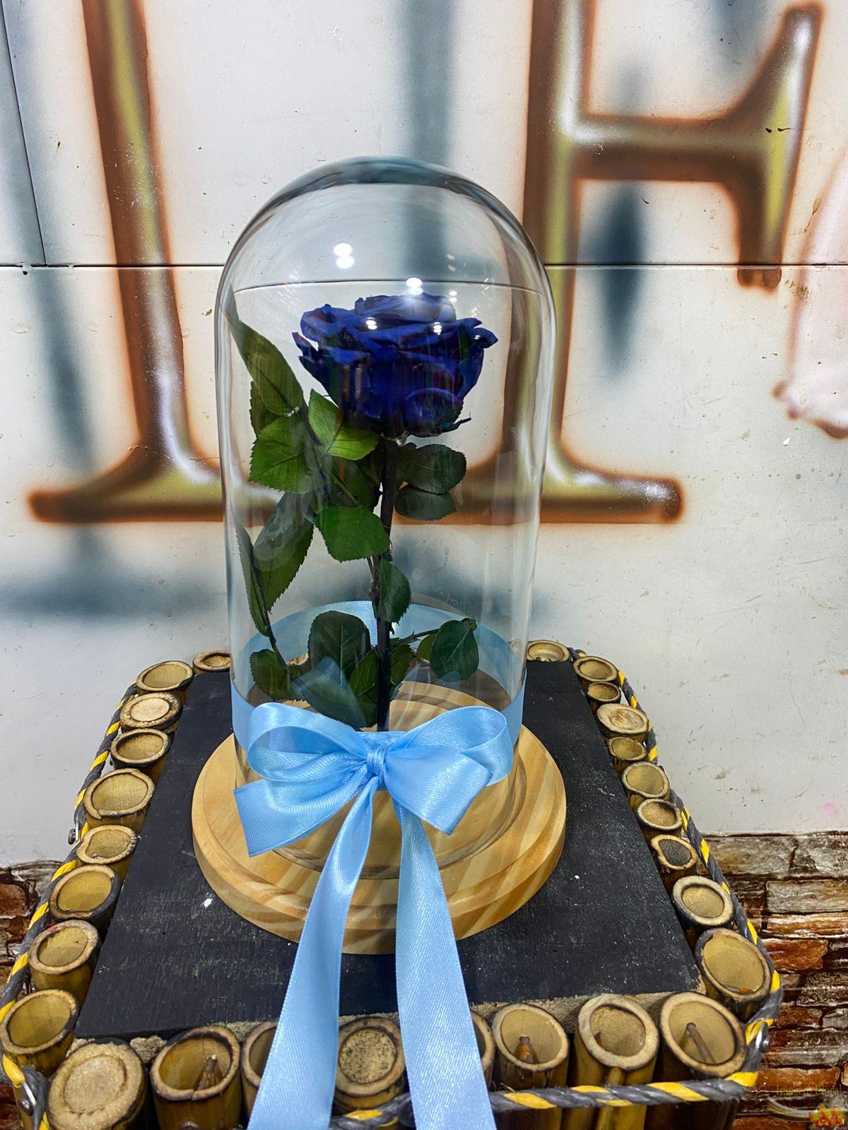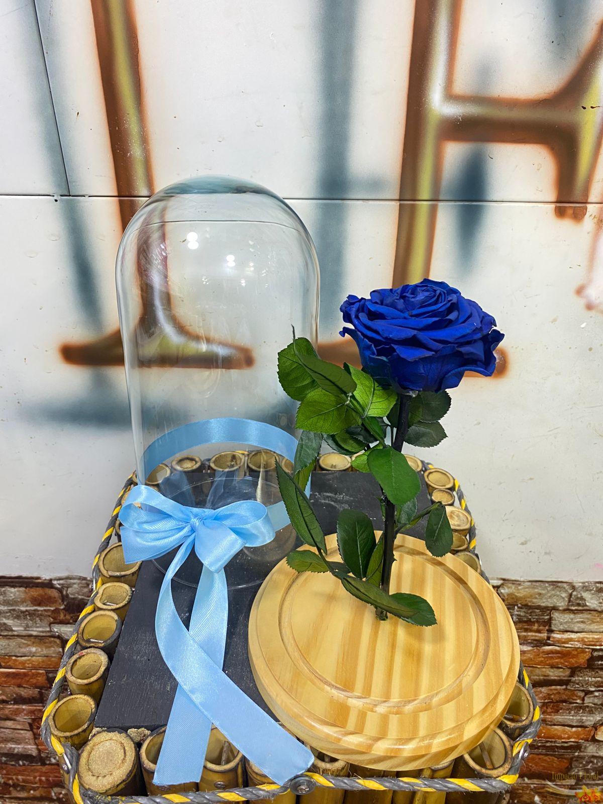 Rosa Preservada Azul que dura aproximadamente 3 años con los siguientes cuidados: Mantener la urna limpia y en su lugar, Debe recibir luz solar.