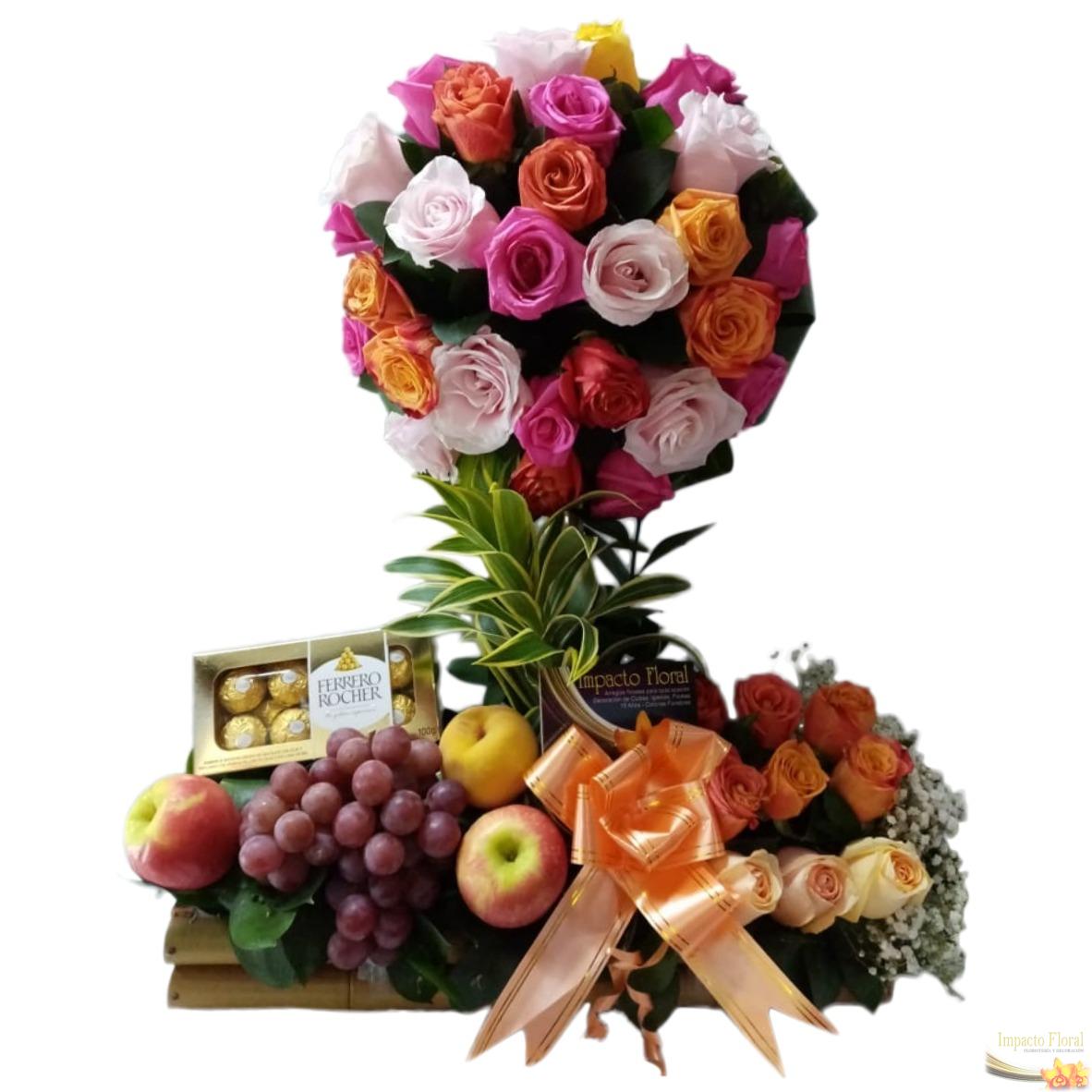 Globo de rosas de un cara (4 docenas de rosa), en una base de bambú donde se encuentran las siguientes frutas: guanabana, papaya, arándanos, manzana, uva chilena. Y acompañado de 10 rosas al lado.