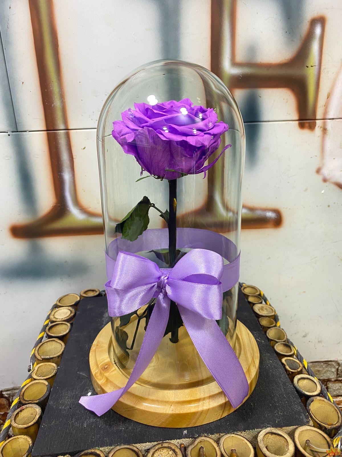 Rosa Preservada Lila que dura aproximadamente 3 años con los siguientes cuidados: Mantener la urna limpia y en su lugar, Debe recibir luz solar.