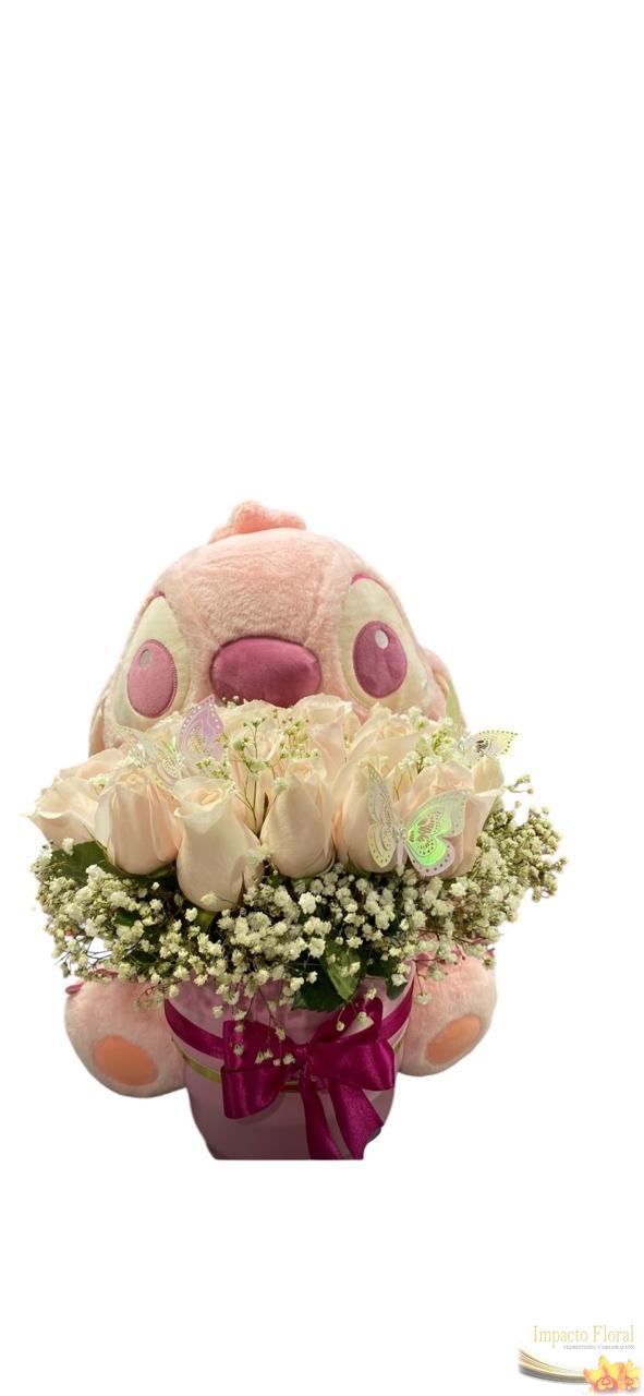 Resaltando que el regalo es único y especial. Caja de 25 rosas rosadas, peluche mide 44cm