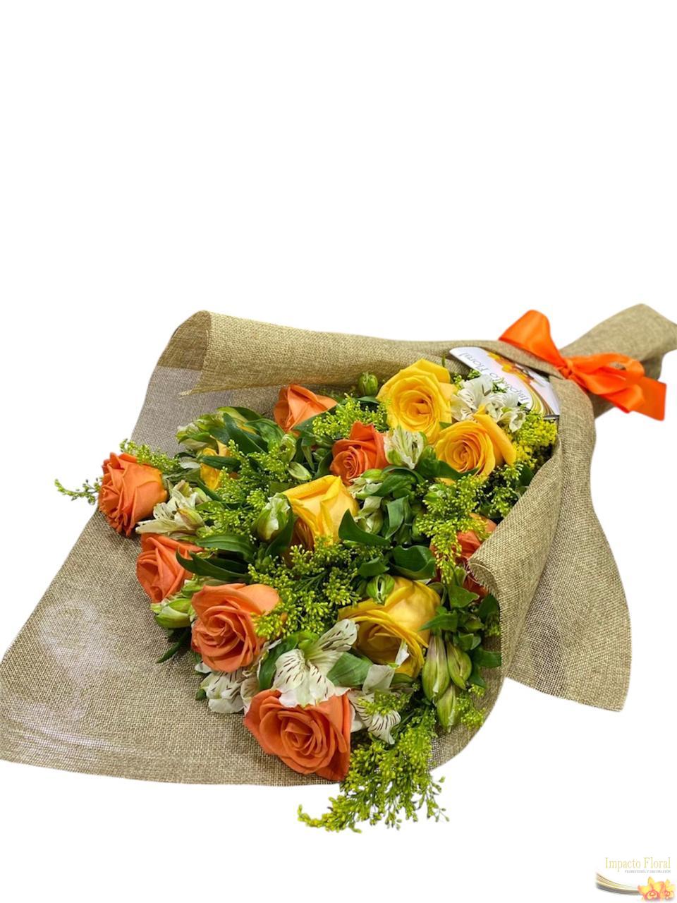 Buqueth de rosas en 2 colores, astromelias, empaque yute y moño decorativo en cinta de tela.